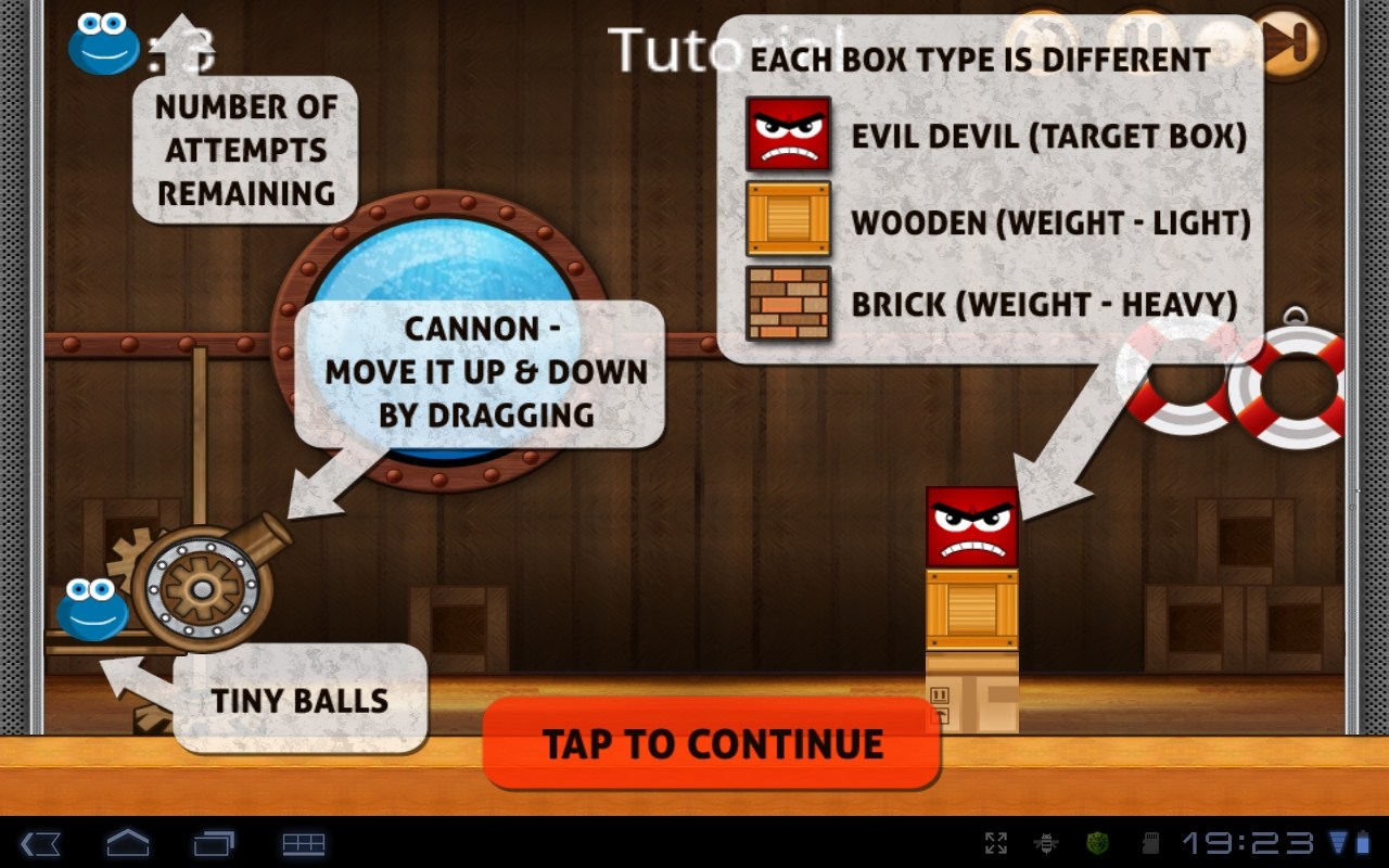 Помогите Tiny Ball`у вернуть свой корабль у очень Злого Дьявола. Для этого у вас есть пушка и живые ядра, которыми и нужно бомбить злодея. Пушку можно перемещать вверх вниз, и производить выстрел в нужном направлении. Цель - столкнуть Злого Дьявола с ящиков на пол. Очень захватывающая аркада, в которой присутствуют элементами физики!