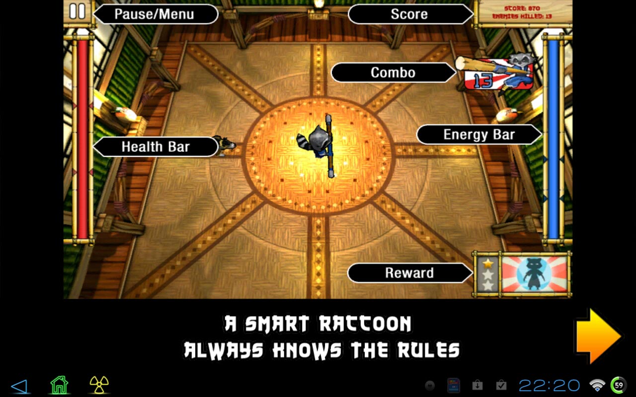 Используйте все свои навыки в кунг-фу для отражения атак противника, а так же невероятные комбо, которое помимо победы повышает ваш уровень мастерства в процессе игры. В сложной ситуации вы можете включить режим обороны, который даст вам небольшую передышку и возможность определиться с дальнейшей тактикой ведения боя!