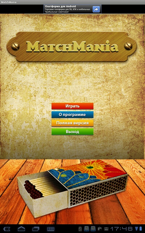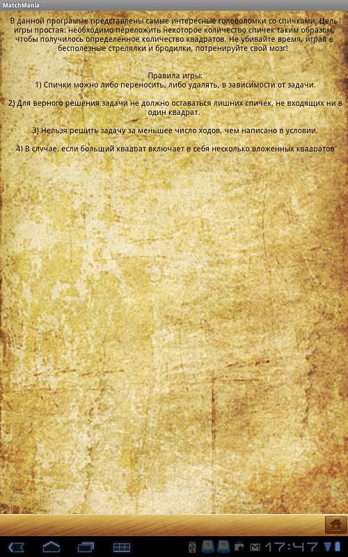 Спичкомания — в данной программе представлены самые интересные головоломки со спичками. Цель игры простая: необходимо переложить некоторое количество спичек таким образом, чтобы получилось определенное количество квадратов. Не убивайте время, играя в бесполезные стрелялки и бродилки, потренируйте свой мозг!