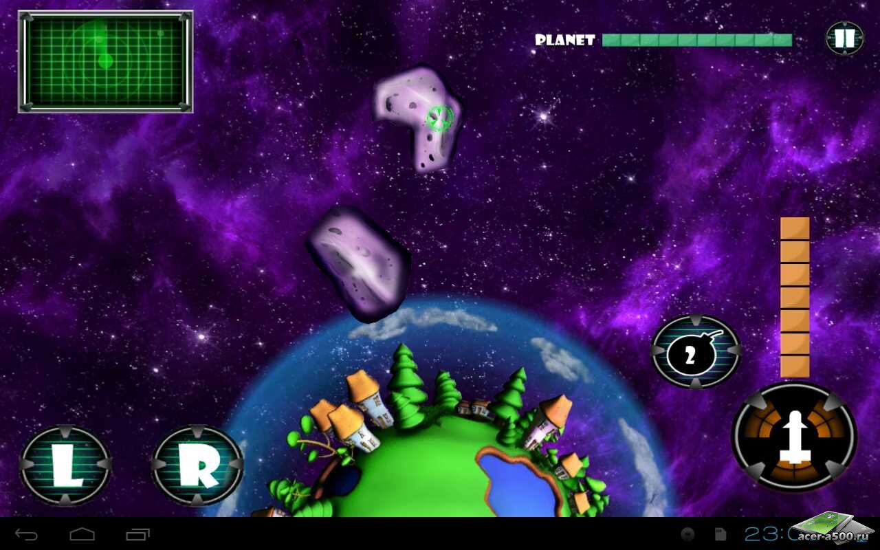 Новая разновидность жанра, где вам предстоит оборонять землю от летящих на неё астероидов! Вы должны вращать планету на 360 градусов, отыскивая астероиды, и ящики с оружием и бонусами, в чем вам всегда помогает радар в левом верхнем углу экрана. Красивая мультяшная графика, простое управление, захватывающий геймплей, все, что надо отличной игре!