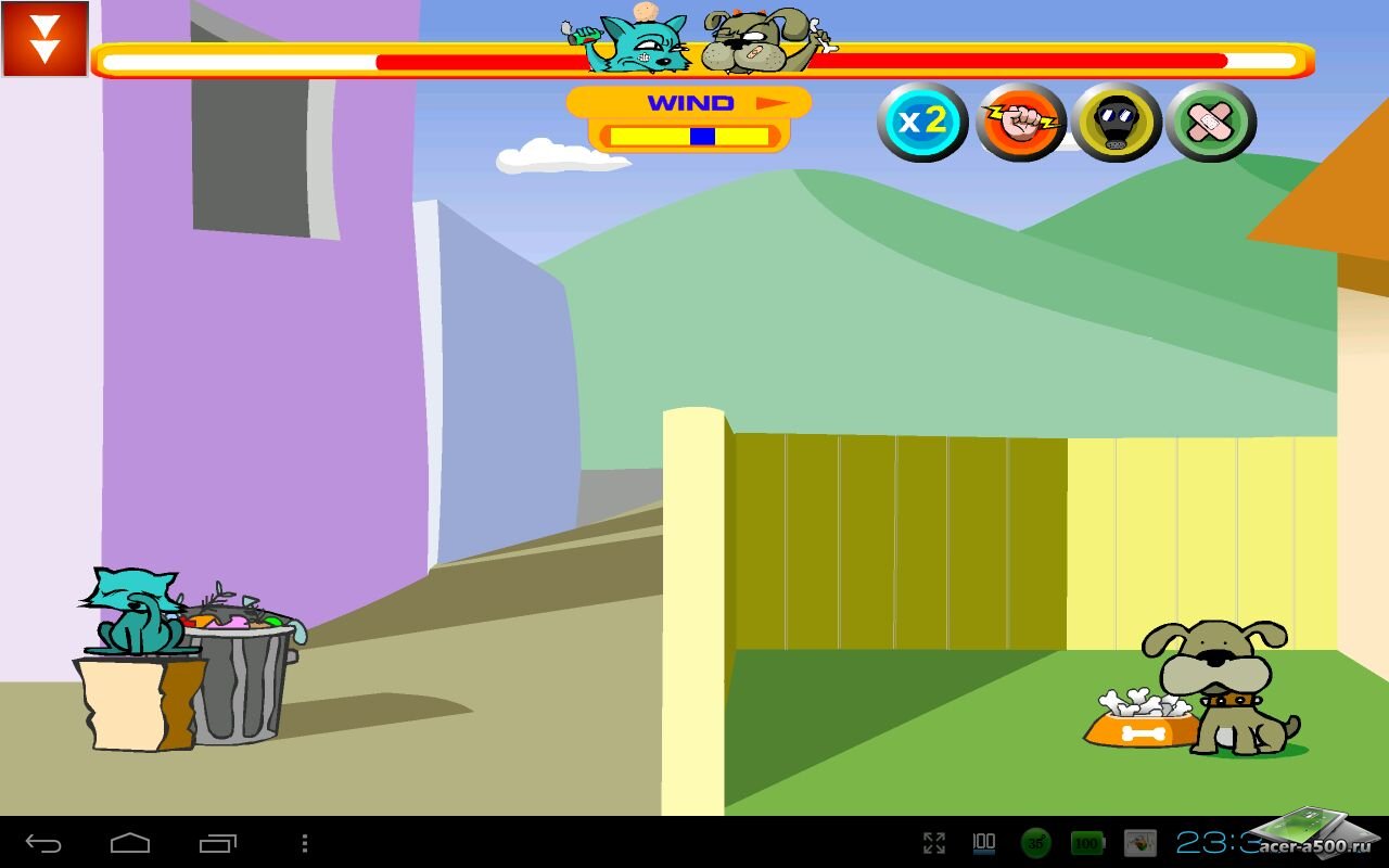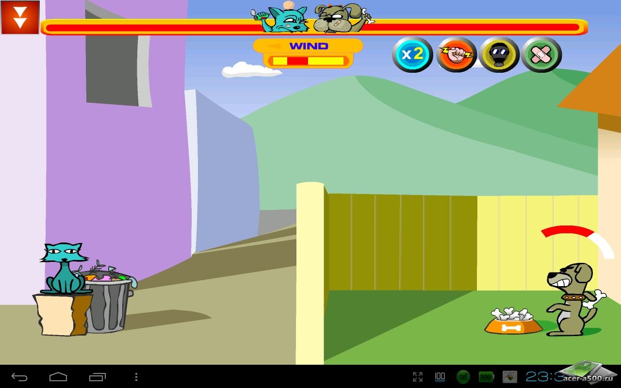 Cat vs Dog Free - веселая игра, в которой столкнулись два враждебных животных - кошка и собака. Они находятся на расстоянии друг от друга за большим забором, но даже это им не мешает делать друг другу пакости. Швыряйте в кошку кости, учитывая силу и направление ветра. В ответ вам будут лететь банки из мусорного бака. Чем точнее вы будете попадать, тем быстрее выведите противника из строя. В игре доступны бонусы, которые можно использовать, выбрав их в верхней части экрана.