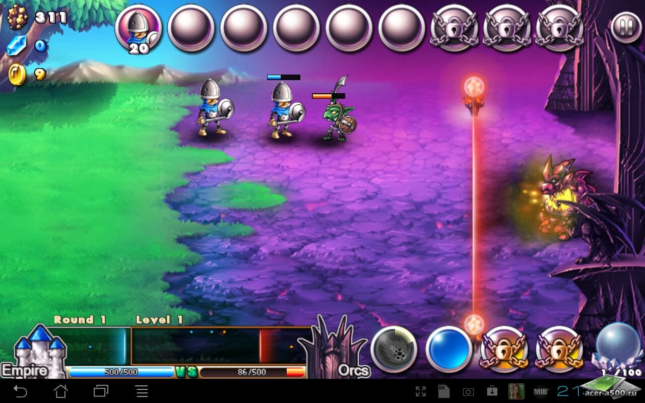 Empire VS Orcs - сокрушите врага вражеского племени и уничтожьте логово орков, используя всю свою мудрость! Орки прокляты тьмой и нападают с огромной жестокостью. Выставляйте воинов, используйте всевозможное бонусное оружие, чтобы избежать сокрушительного удара на вашу сторону, а самое главное, ведите активное нападение и уничтожение врага! По ходу игры открывайте новых воинов, более сильных и с более лучшими возможностями сражений.