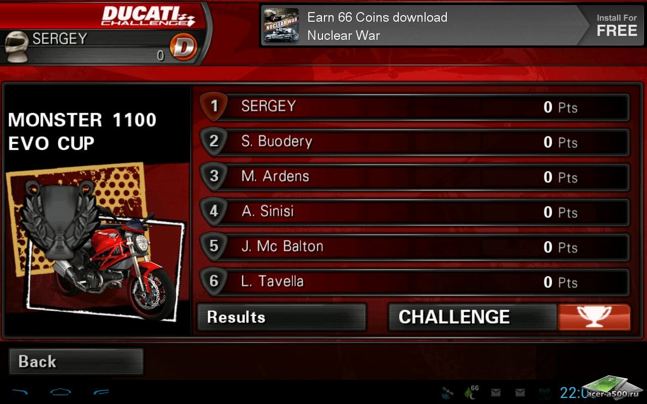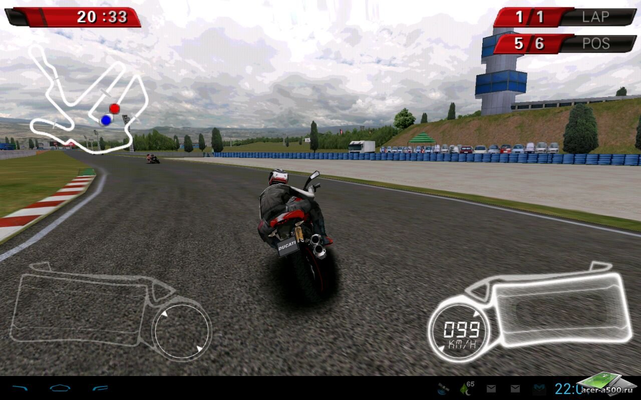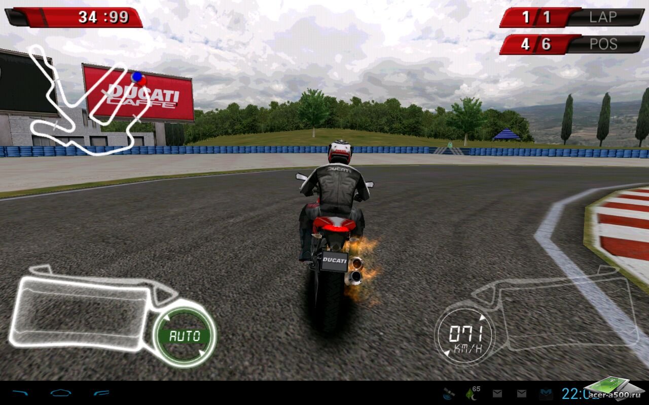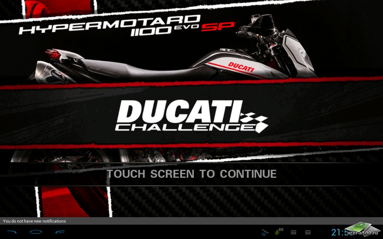 Ducati Challenge - почувствуй адреналин высокой скорости на одном колесе гоночного мотоцикла в своей руке! Вас ждут захватывающие и уникальные острые ощущения езды на официальных мотоциклах Ducati в потрясающей 3D гоночной игре! Езда на заднем колесе, езда на переднем колесе, обгоны, высокая скорость и точность управления не оставят поклонников подобных игр равнодушными. Гоняйте на самых мощных мотоциклах, включая Monster 1100 EVO, Hypermotard 1100 EVO SP, Diavel Carbon, Multistrada 1200 S, Streetfighter S, Superbike 1198 SP, Multistrada Pikes Peak, Diavel Cromo и Superbike 1199 Panigale S. Рев двигателей был записан с реальных звуков работы мотоцикла с учетом поклонников Ducati и огромного опыта! Вас ждут оригинальные и разнообразные треки, включая извилистые горные дороги, узкие средневековые деревенские улочки, оживленные мегаполисы и горячая пустынная долина, где можно дать мотоциклу хорошего газа! В режиме чемпионата вам нужно пройти все соревнования, чтобы стать чемпионом. Игра получила очень хорошую графику, качество которой можно отрегулировать в настройках в зависимости от производительности вашего устройства. В игре имеется галерея изображений и достижений.