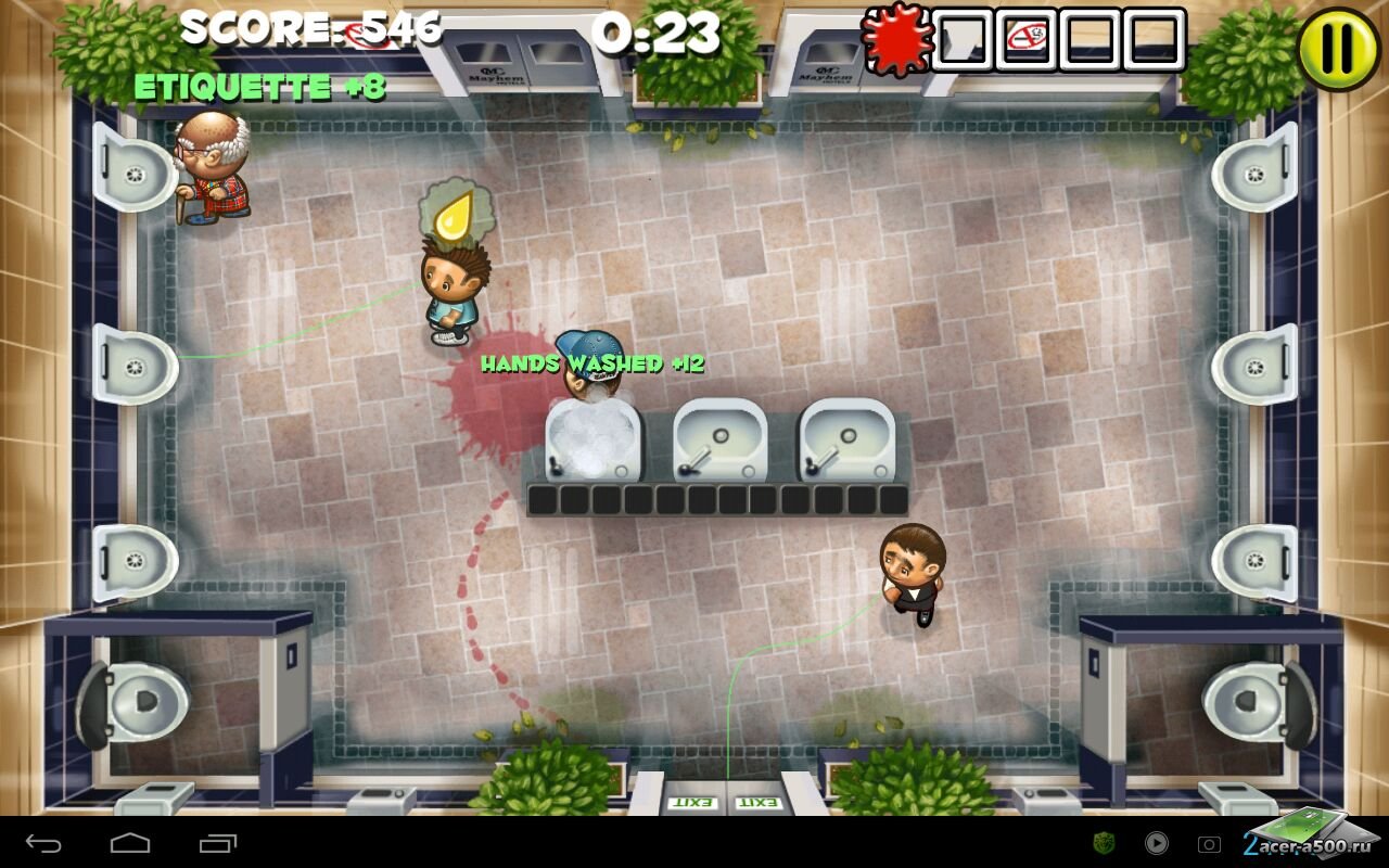 Men's Room Mayhem - превосходная игра, в которой вам предстоит координировать людей в мужском туалете! Избегайте столкновений, которые приводят к дракам что бы не тратить лишнее время на уборку. А за соблюдение правил личной гигиены вам будут предоставлены бонусы. Игра обладает хорошо прорисованной мультяшной графикой удобным геймплеем и множеством локаций туалетов.