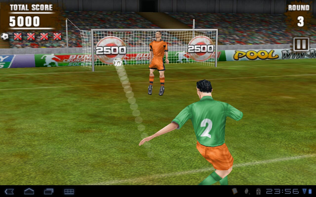 Football Kicks - симулятор штрафных и пенальти. В игре нужно будет пробивать по воротам, но бить нужно ни куда попало. На воротах будут указаны зоны, удары по которым будут приносить вам максимальное количество очков, а также увеличивать вам отведенное время на серию ударов. Задача - пробивать по воротам и набрать как можно больше очков, которые позволят вам открывать новые уровни игры. Естественно на воротах стоит защита, сначала в виде вратаря, далее группы защитников, так что забивать каждый раз становится все тяжелее. Сложность еще увеличивается тем, что ваше местоположение относительно ворот меняется и иногда нужно наносить крученые удары чтобы попасть в ворота.