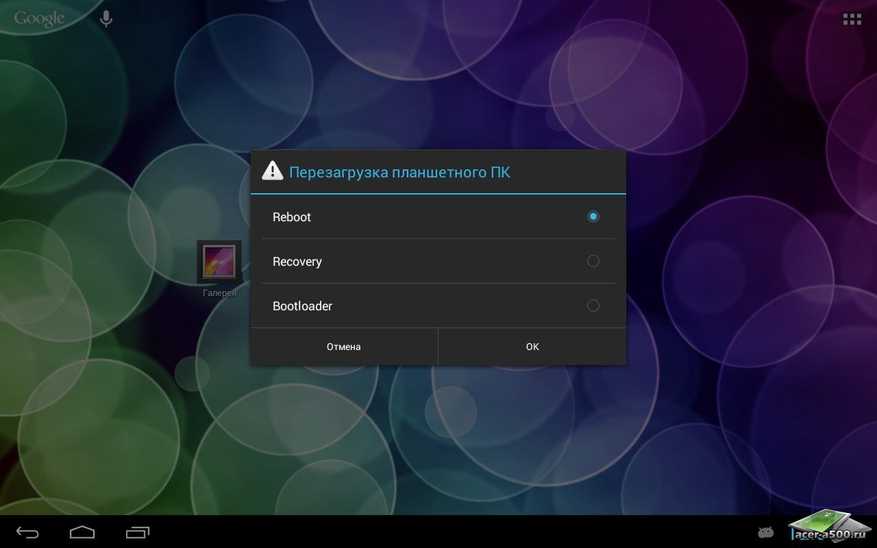 3. Выключите планшет. Зажмите кнопку уменьшения громкости и кнопку включения устройства. Через некоторое время вы увидите логотим Acer и белый мелкий текст в левом-верхнем углу (только после этого необходимо отпустить зажатые кнопки), а через некоторое время включится рекавери. Управление меню осуществляется кнопками громкости, а выбор кнопкой выключения.