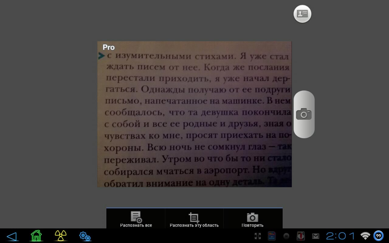 MobiReader BizCard & Docu OCR - самое лучшее и удобное приложение для распознания визитных карточек и документов. Имеет простой интерфейс. Есть возможность редактирования и сохранения только что распознанного текста в формате .txt. Намного лучше, чем Fine reader.