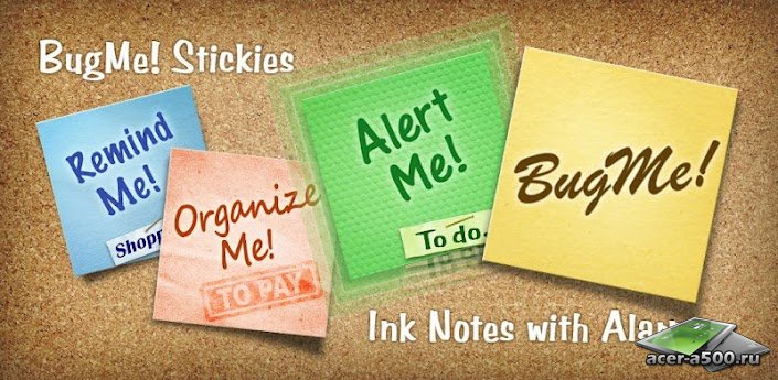 Замените бумажные стикеры на BugMe! Вам больше не придется переводить кучу канцтоваров, используйте BugMe! совместно с вашим Android устройством, записывайте и зарисовывайте планы, а также устанавливайте напоминания и приложение напомнит вам о важном событии, которое не желательно пропустить. Все созданные виртуальные стикеры помещаются на главный экран приложения и могут быть удалены или отредактированы в любой момент, а также возможно сгруппировать несколько в одном месте. Для быстрого доступа к приложению, а также быстрому просмотру виртуальных стикеров используйте виджет размером 3 на 3.