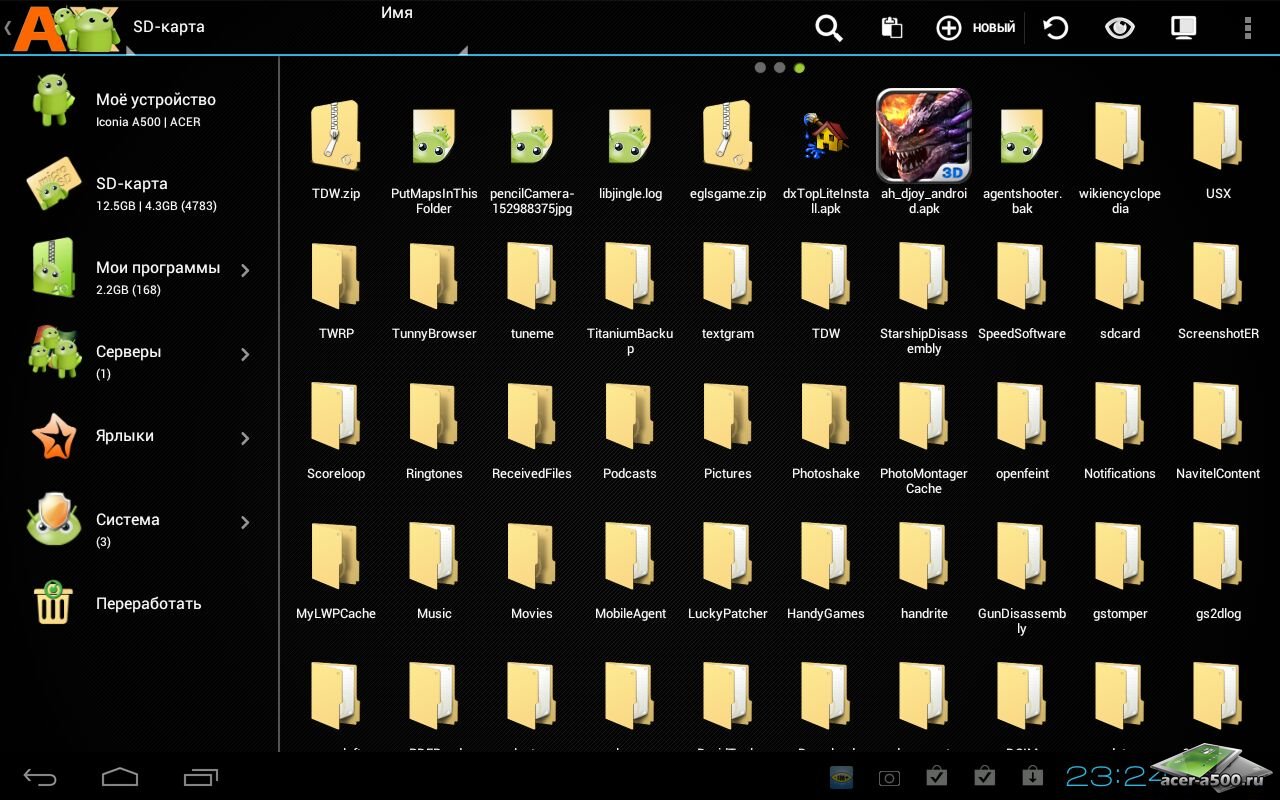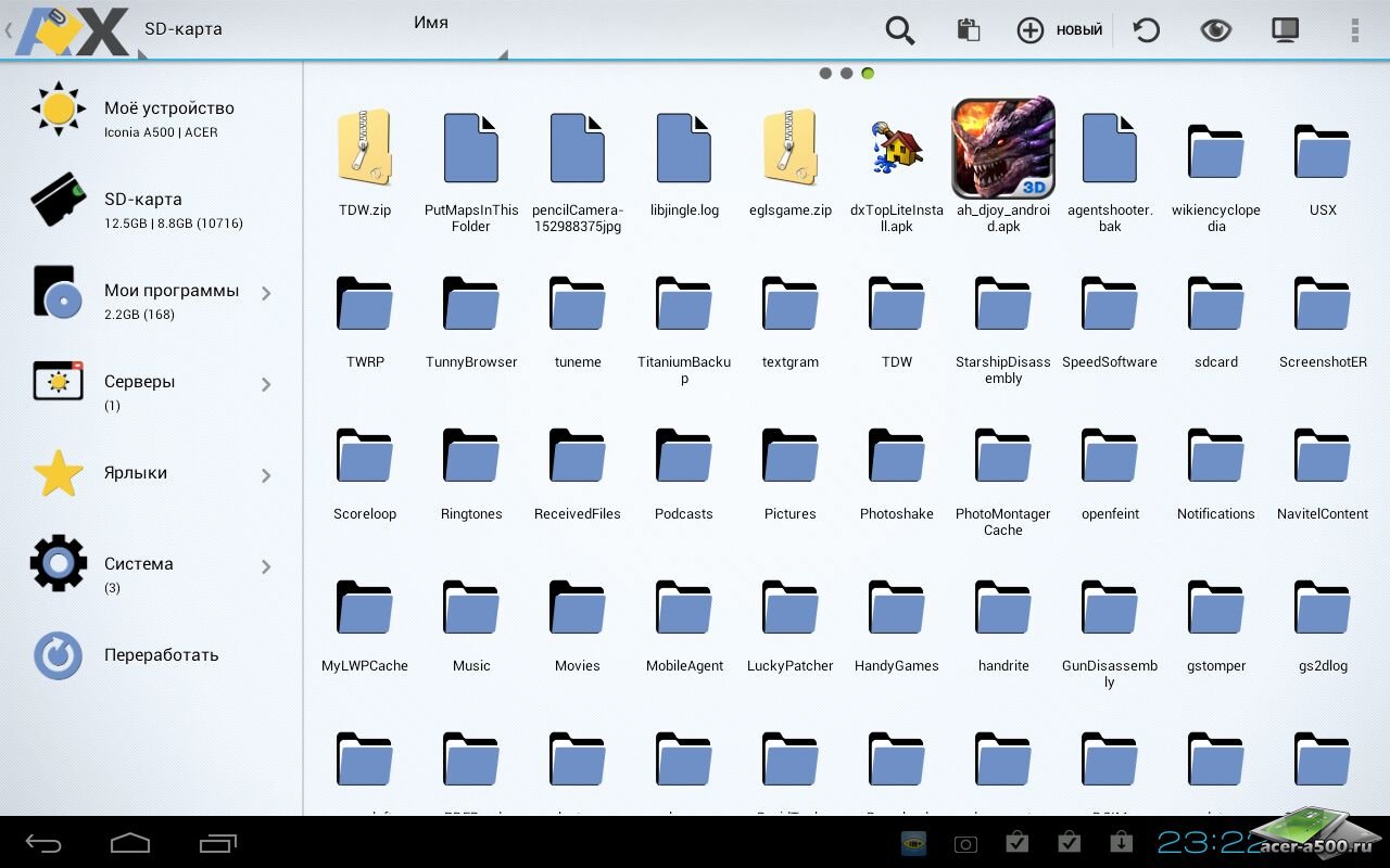 • Три полностью независимые вкладки, которые отображают различные родительские папки (внешняя карта, внутренняя память, сетевой ресурс), переход между ними осуществляется жестом перелистывания. Каждая вкладка кэшируется системой и позволяет отображать эскизы, размер, дату, название файлов и папок сразу. Четыре режима отображения для каждого вида, а также четыре варианта сортировки.