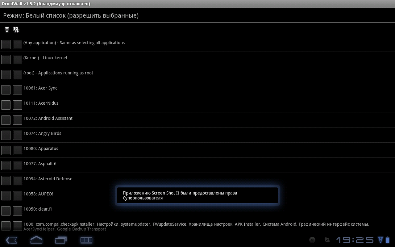 Брандмауэр собственной персоны, разрешает и запрещает лезть программам в интернет. Настройки брендмауэра позволяют отдельно либо разрешать, либо запрещать доступ в интернет через сети wifi или 3g по отдельности. Установив режим белый список вы сможете разрешать приложениям выход в интернет через какую либо сеть, для этого нужно поставить галочки, там где нет галочек выход в интернет будет запрещен. И черный список, полная противоположность белому, везде где есть галочки выход в интернет запрещен, там же где их нет, разрешен.