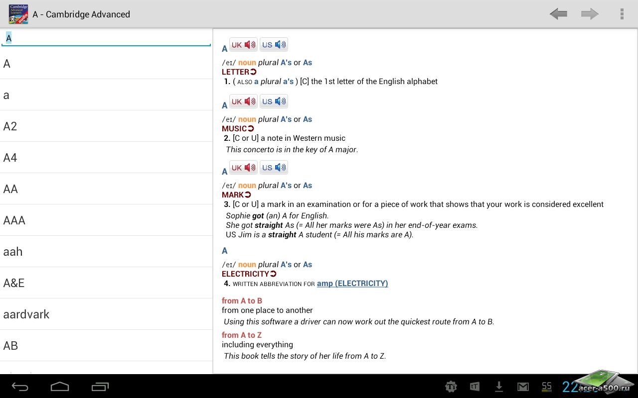 Audio Cambridge Advanced - Кембриджский английский словарь с более чем 70-ю тысячами слов и примеров. Отлично подойдет для изучения английского языка, а также правильного произношения слов за счет функции аудио прослушивания. Приложением имеет более 79800 высококачественных аудиозаписей произношений слов в вариантах США и Великобритании. Вы найдете иллюстрации и фотографии слов определений. Audio Cambridge Advanced имеет более 90 000 примеров с полными предложениями, чтобы понять использование определений, более 25 000 словосочетаний, автоматическое распознавание флективных форм и многое другое. Приложение имеет быстрый динамический поиск слов, хранит историю последних 50-ти просмотренных слов, фильтры для упрощения поиска, быструю прокрутку статей. Имеется виджет для рабочего стола.