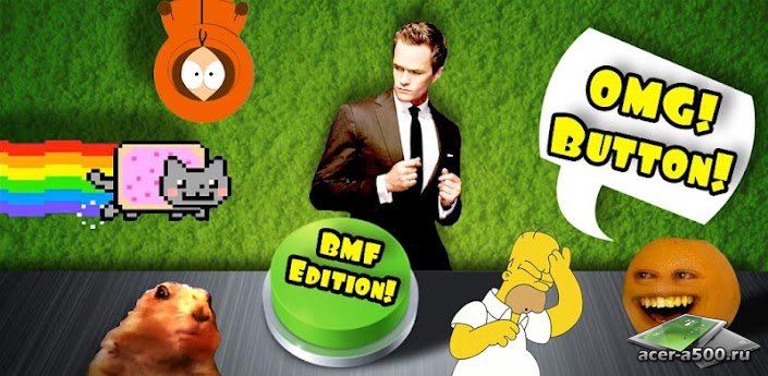 OMG! Button! BMF Edition - приложение, которое сочетает в себе лучшие мемы интернет звуков с виджетами и поиском. Жмите на кнопки, слушайте звучание, и звук, который вам понравиться можно установить в качестве будильника или звука уведомления, а для пользователей смартфонов в качестве звонка.