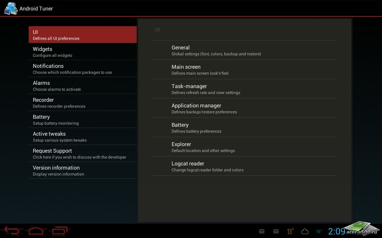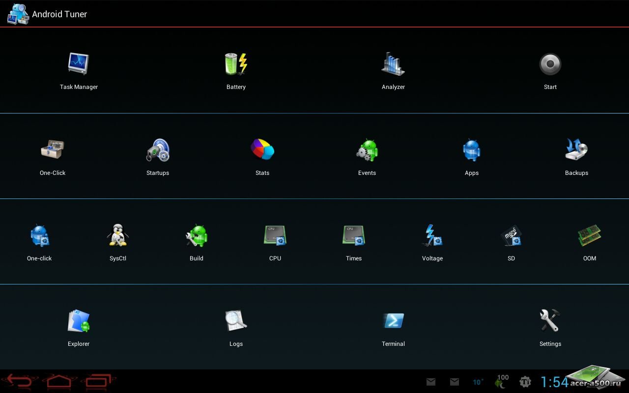 Android Tuner - это наиболее полное приложение для мониторинга и контроля вашего Android устройства. Приложение находится на этапе бета тестирования, поэтому перед его использованием рекомендуется сделать бекап системы. Для работы приложения требуются root права. Приложение обладает уникальными возможностями, которых вы нигде больше не увидите: чистая перезагрузка, включение / выключение APN, открытие BT, локализация GPS и WiFi, автоматическое резервное копирование установленных приложений, Logcat-ридер для Android JellyBean 4.1.x, графические виджеты мониторинга, отчеты потребления тока с помощью мили амперметра. Также приложение включает в себя файловый эксплорер, менеджер запуска приложений, управление событиями приложений, систему удаления приложений, мониторинг батареи, процессора, сети и памяти, статистику приложений, диспетчер задач, автоматический таск киллер, эмулятор терминала, твики процессора, настройки SD, редактор Sysctl и Build.prop, виджеты, оптимизатор приложений, хранитель батареи и многое другое!