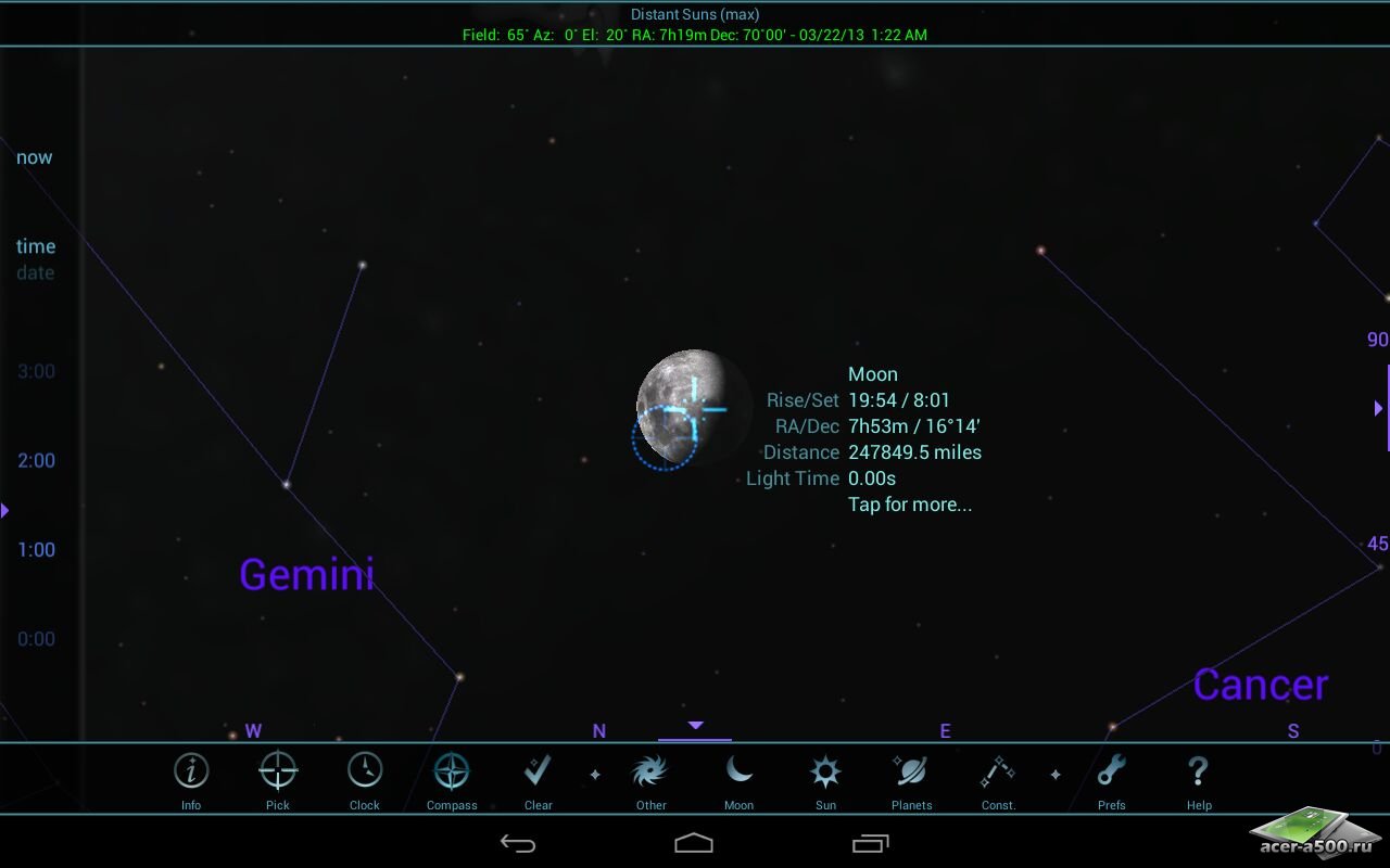 Distant Suns (max) - астрономическое приложение, разрабатывающееся более 25 лет и получившее множество наград. С помощью Distant Suns вы получите новый способ посмотреть на космические объекты. Здесь вы найдете подробную информацию о более чем 130000 звезд, 8(9) планет, Солнце, Луне, созвездиях, более 200 галактик, туманностях и звездных скоплениях. Совершите свое виртуальное путешествие по звездам. Вы можете установить свое местоположение в любой точке земли, изменить дату и время, чтобы посмотреть на прошлое и будущее космоса. Изучайте созвездия и их историю, следите за фазами Луны ежемесячными танцами планет. Приложение позволяет перейти в режим, в котором вы сможете смотреть на экран планшета, словно на небо и видеть там, все, что вы бы увидели посмотрев на небо с любой точки нашей планеты. Чтобы посмотреть подробные данные о любом космической объекту, просто прикоснитесь к нему.