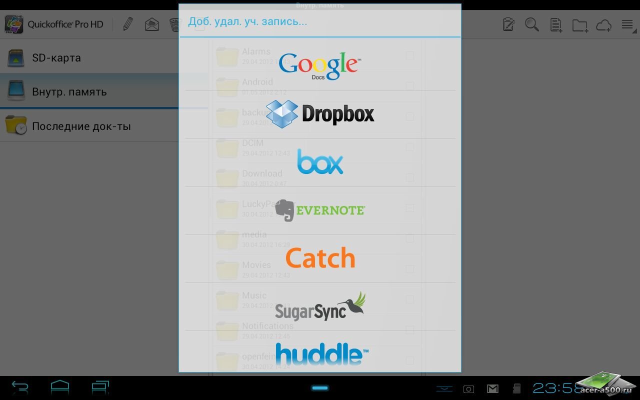 QuickOffice еще одно приложение для работы с документами Microsoft Office. Отличие данного приложения от Documents To Go заключается в том, что QuickOffice способен не только просматривать формат pptx (презентация PowerPoint), но и редактировать данный тип документов. Приложение позволяет открывать документы как из внутренней памяти планшета, так и с внешней SD карты. Также имеется поддержка просмотра PDF файлов.