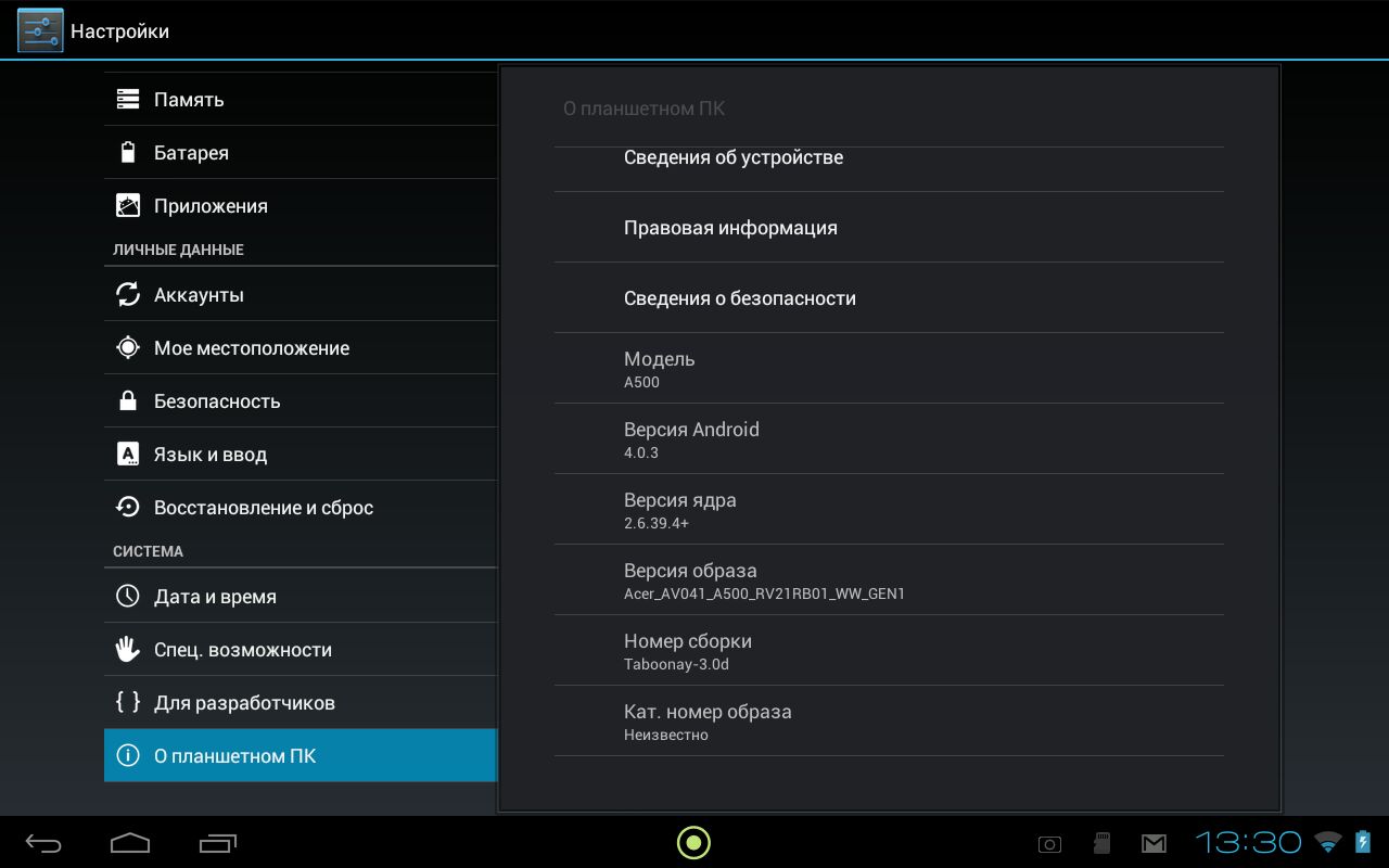 Данная прошивка базируется на последней утечке Acer_AV041_A500_1.033.00_WW_GEN1, в которой были решены ряд проблем, например щелчки из динамиков при наборе текста стандартной клавиатурой, а также произвели некоторые изменения в ядре. В целом работа прошивки стала намного стабильнее. Автор прошивки честно позаимствовал все из прошивки taboonay 3.0.1, о чем свидетельствует информация, о планшетном ПК. Также я не нашел приложения SuperUser в составе прошивки, но оно спокойно устанавливается отдельно и все прекрасно работает.